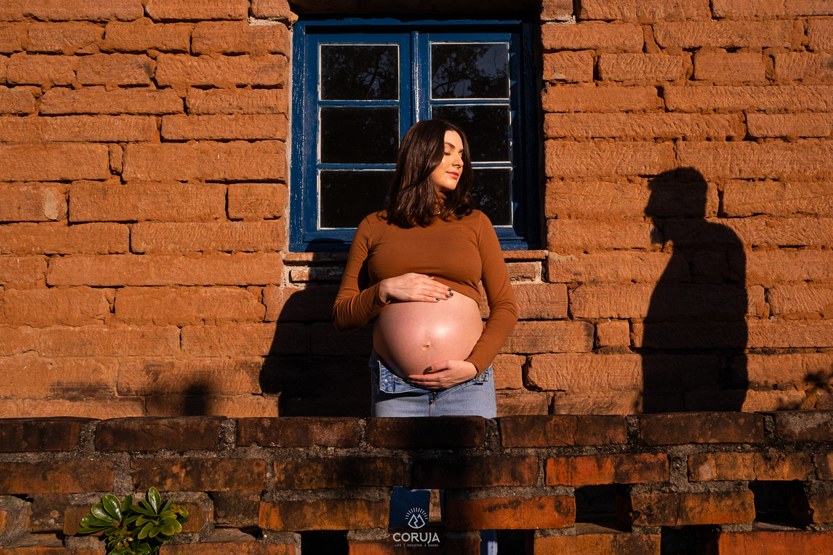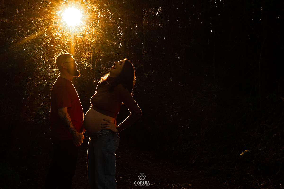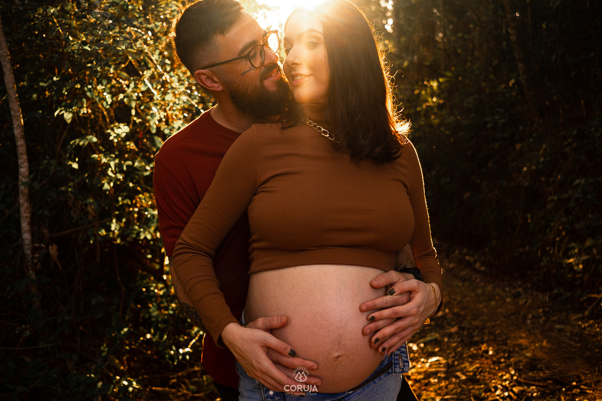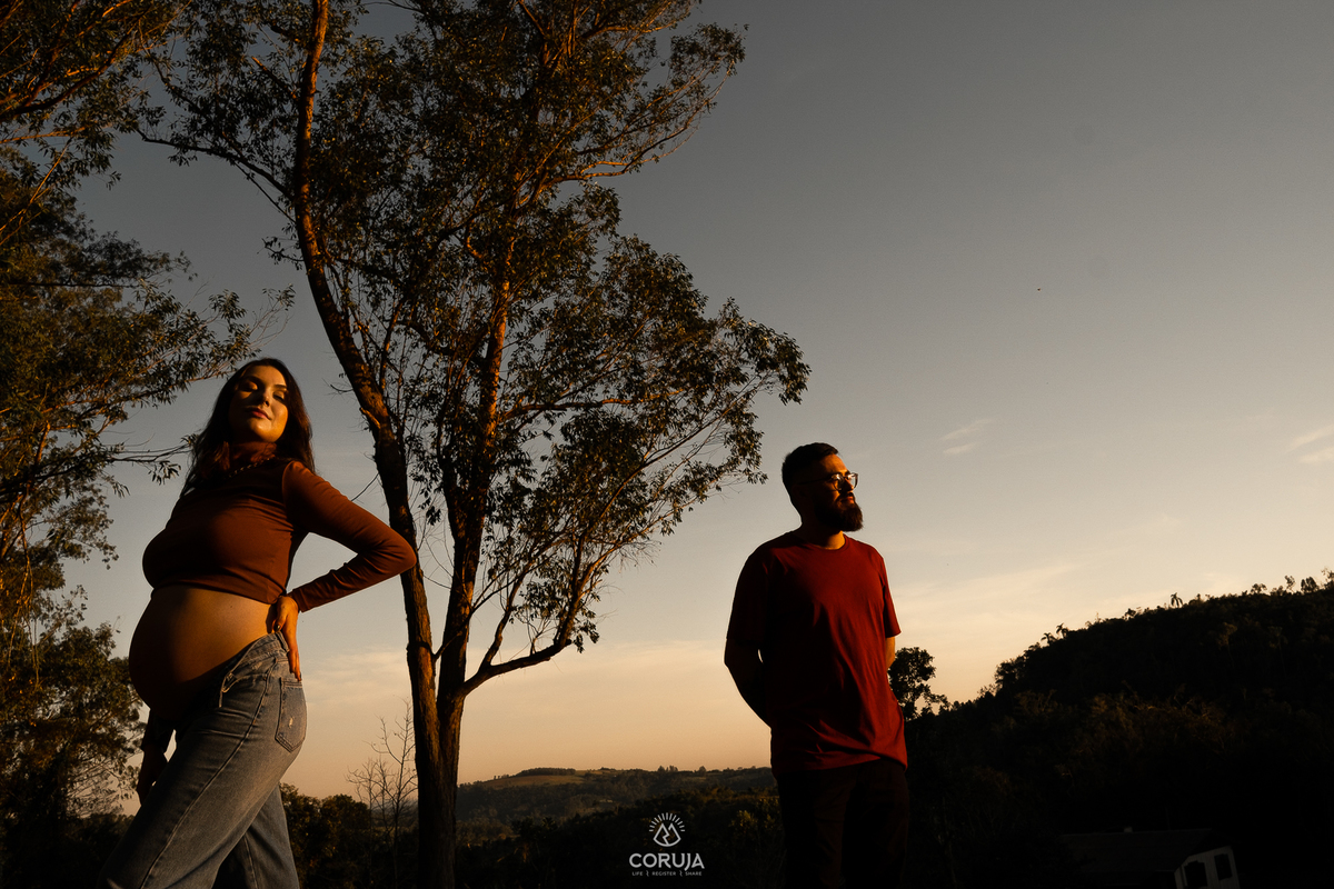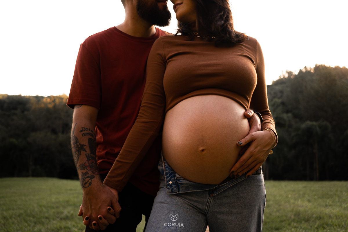 O fim do dia, com luz suave e natural realça a beleza da maternidade e a alegria dessa fase tão especial.