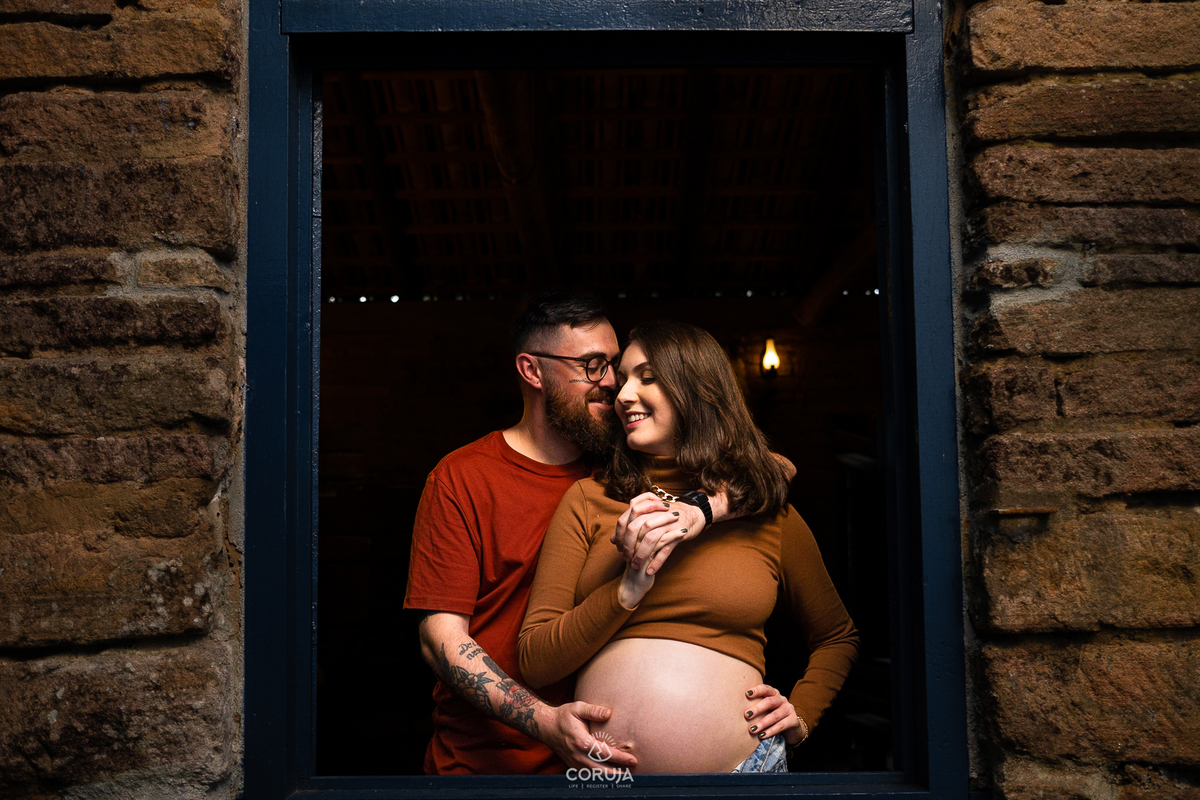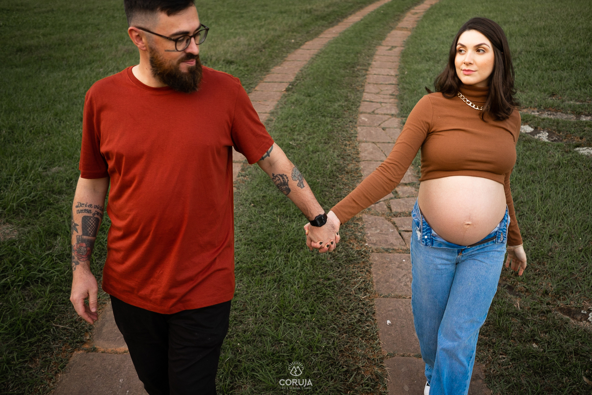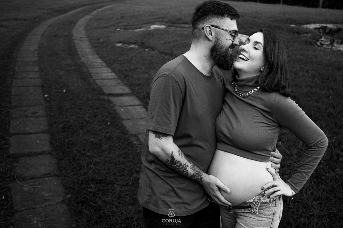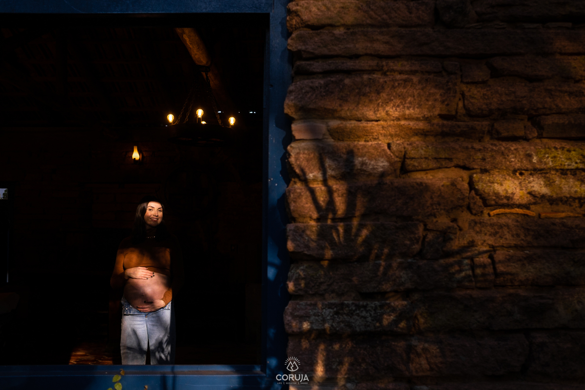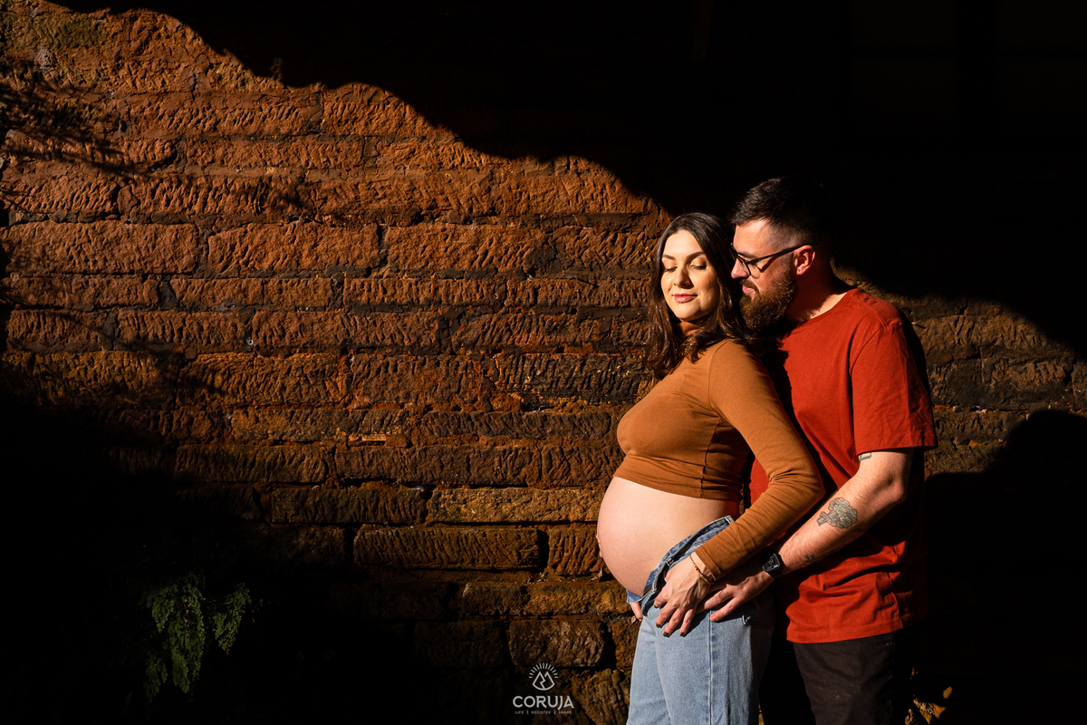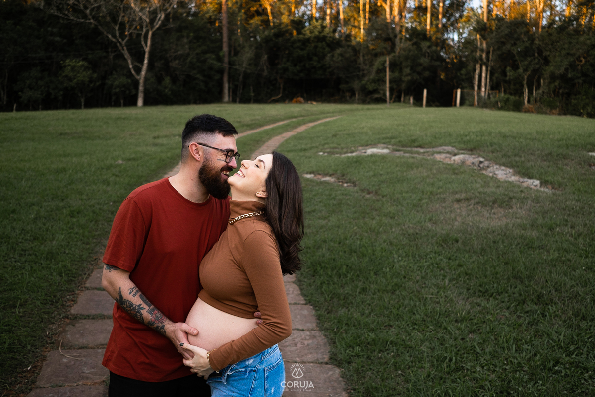 O fim do dia, com luz suave e natural realça a beleza da maternidade e a alegria dessa fase tão especial.
